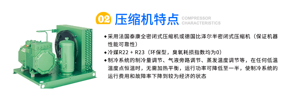 壓縮機: 1,采用法國泰康全密閉式壓縮機或德國比澤爾半密閉式壓縮機(保證機器性能可靠性) 2,冷媒R22 + R23(環(huán)保型,臭氧耗損指數(shù)均為0) 3,制冷系統(tǒng)的制冷量調節(jié)、氣液旁路...